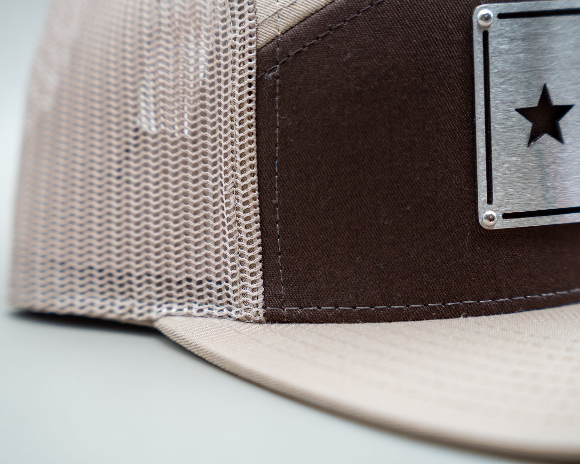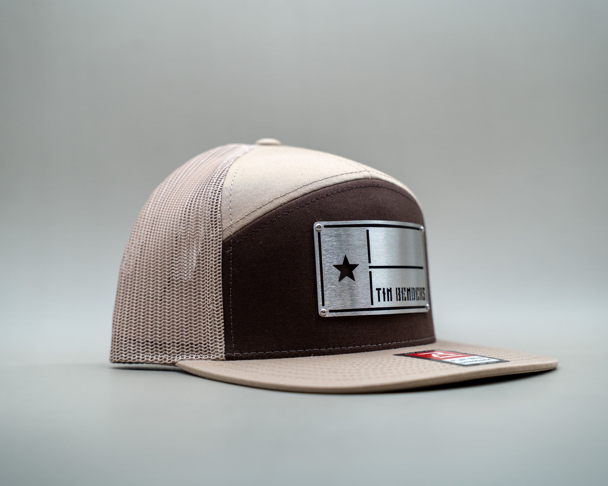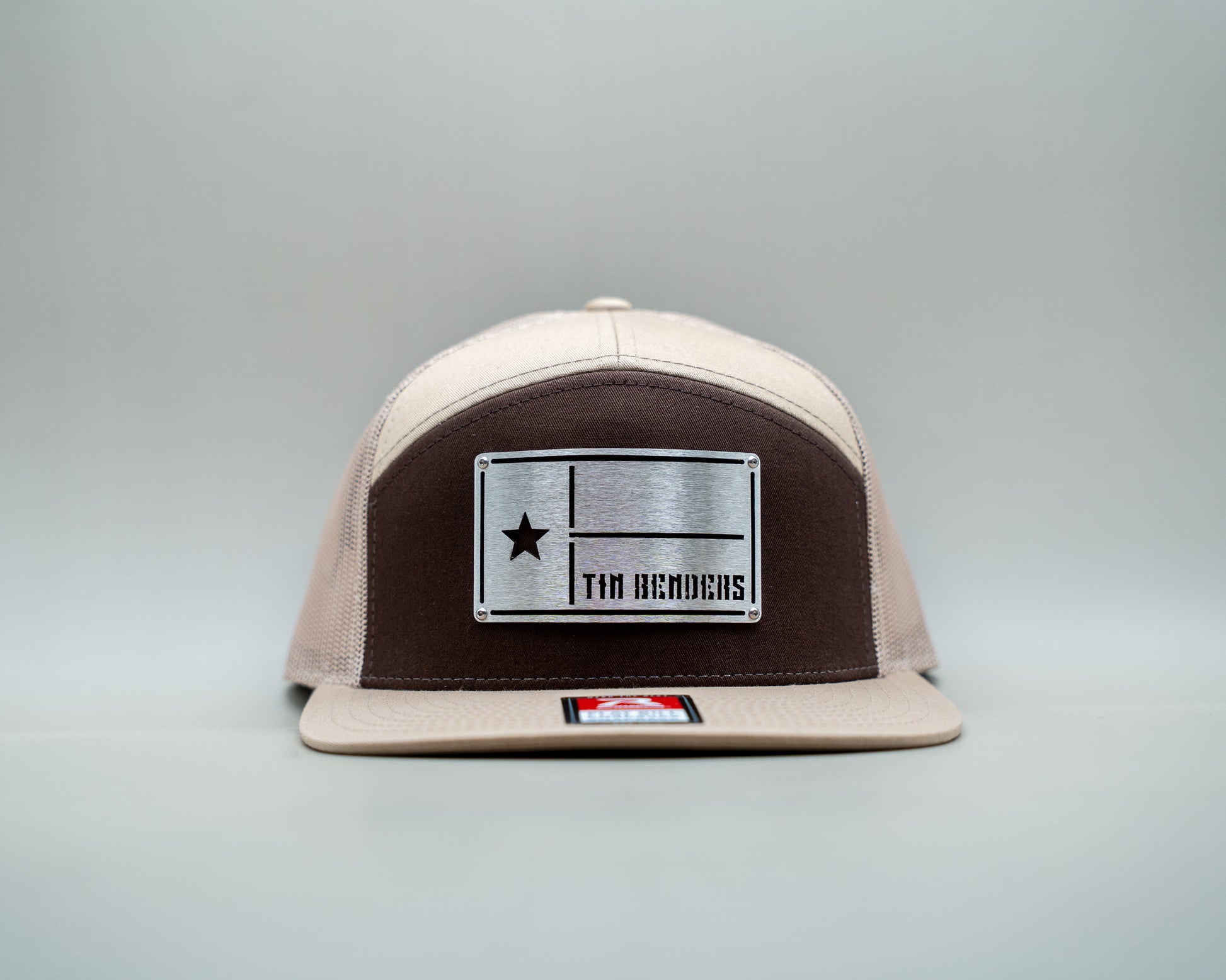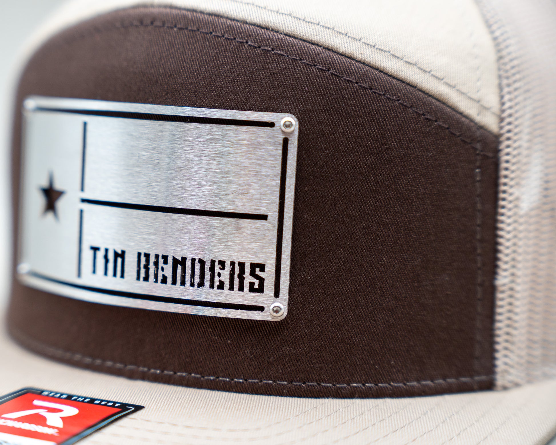 Closing out the Tin Benders Aluminum Plate Collection, the Desert Forge hat brings rugged simplicity to the lineup. Built with an all-beige crown and mesh, accented by a dark brown front panel, it delivers a timeless, earthy look. On the front, the signature aluminum Texas flag plate with “Tin Benders” precision-cut into the design stands as a bold symbol of craftsmanship. Durable, versatile, and proudly Texan — this cap is made for everyday wear on the job, in the field, or around town.