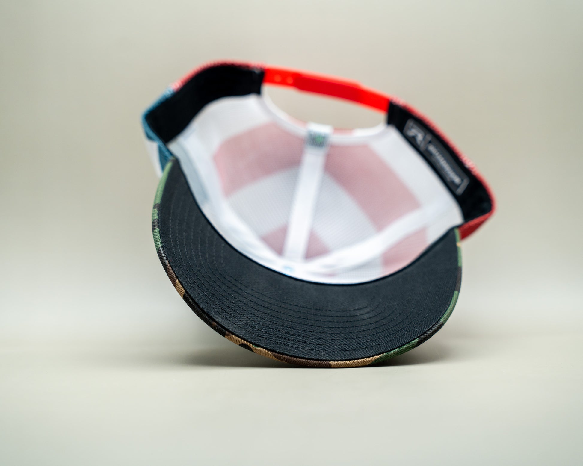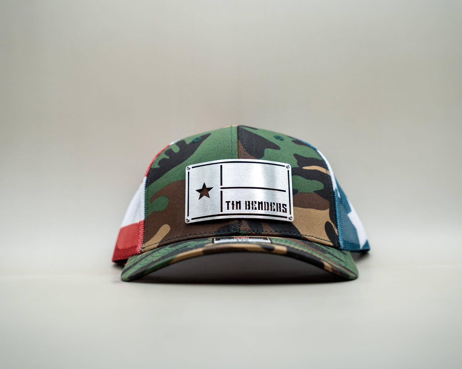 Part of the Tin Benders Aluminum Plate Collection, the Patriot Camo hat combines rugged outdoor style with American pride. Featuring a casual camo bill and front panel paired with a red, white, and blue American flag mesh back, this cap is bold from every angle. Front and center, the signature aluminum Texas flag plate with “Tin Benders” precision-cut into the design reflects the same craftsmanship and grit that defines our work. Tough, patriotic, and built for everyday wear — this hat is Texas pride with American spirit.