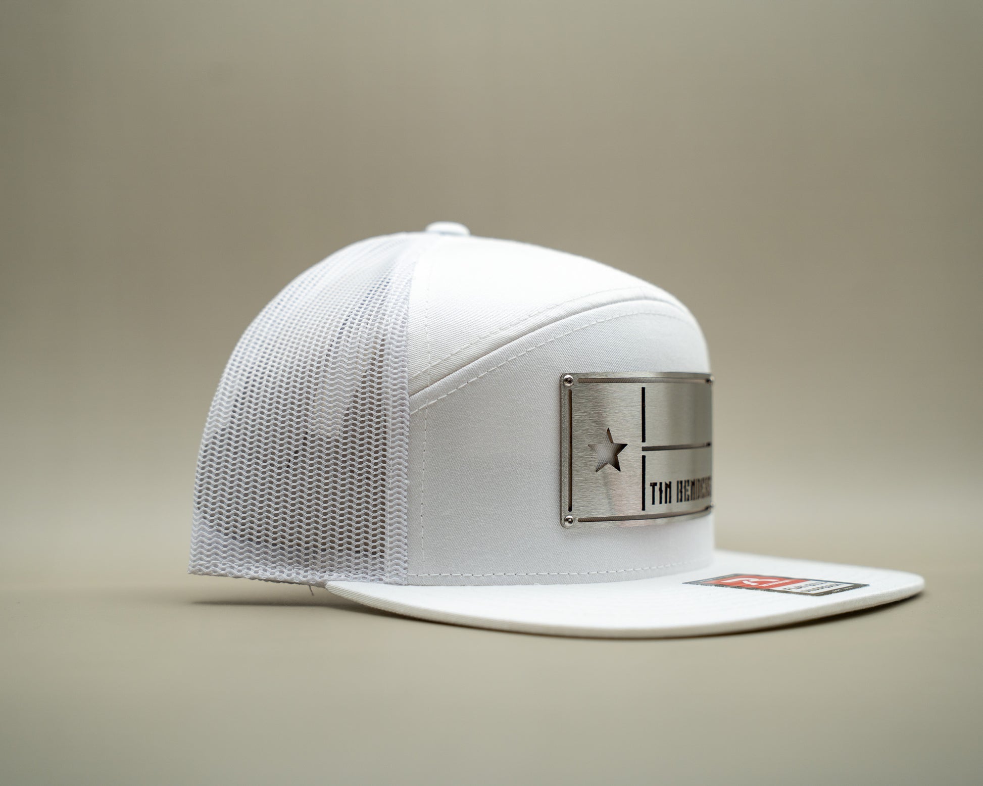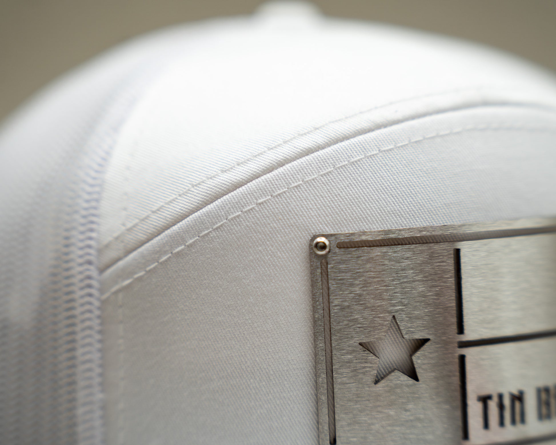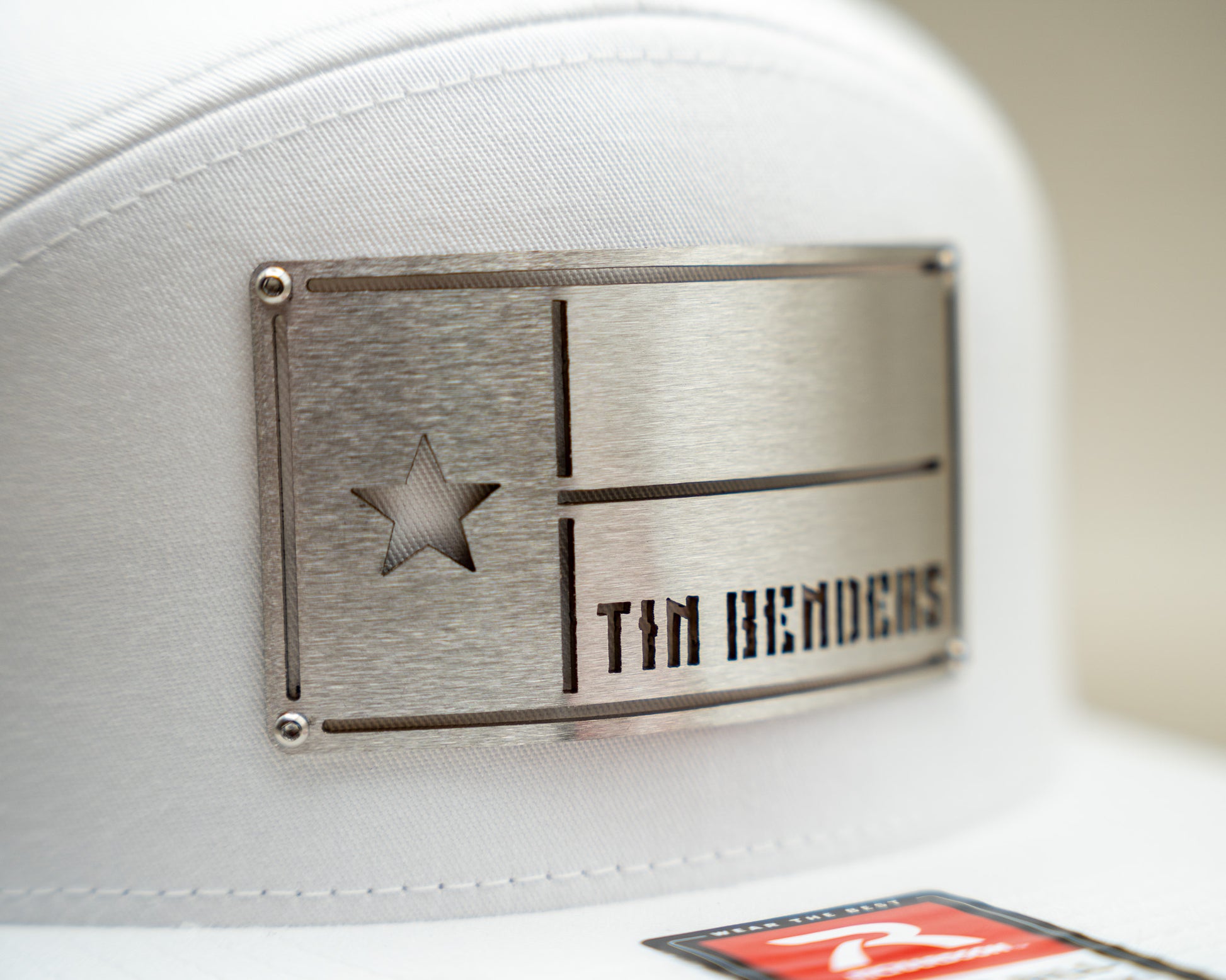 Part of the Tin Benders Aluminum Plate Collection, the Pure Steel hat is a clean and bold take on Texas pride. Featuring a solid white crown and bill with a breathable mesh back, this cap is crisp, versatile, and built for everyday wear. Front and center is the signature aluminum Texas flag plate, with “Tin Benders” precision-cut into the design — a proud nod to our craftsmanship in metal fabrication. Sleek and durable, this hat is as tough as steel and sharp as your style.