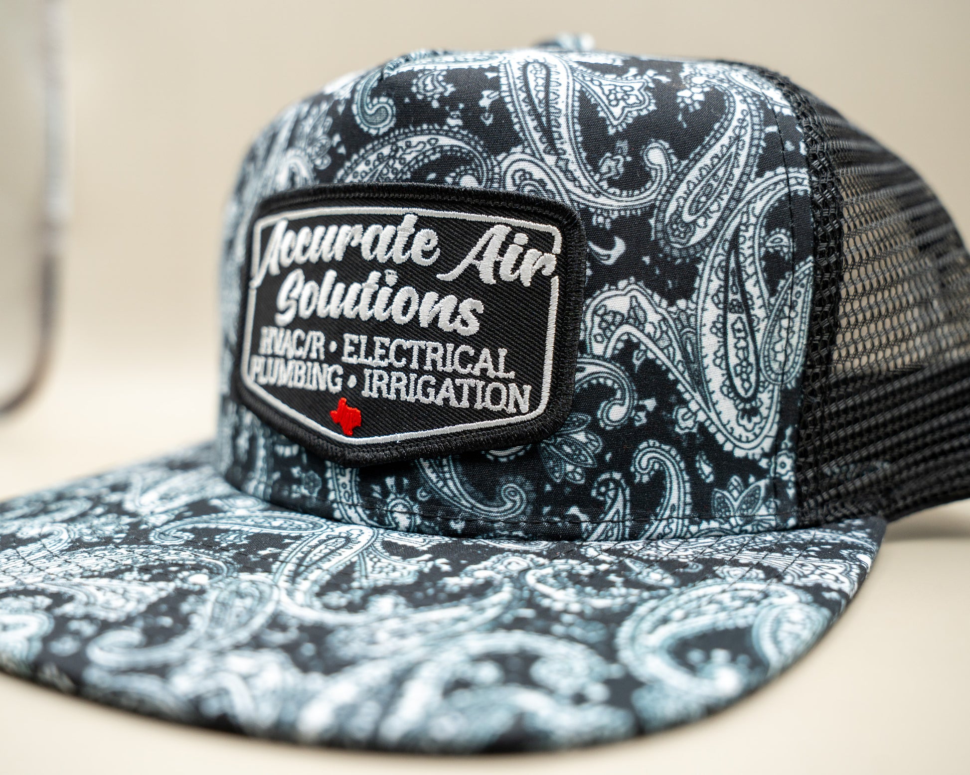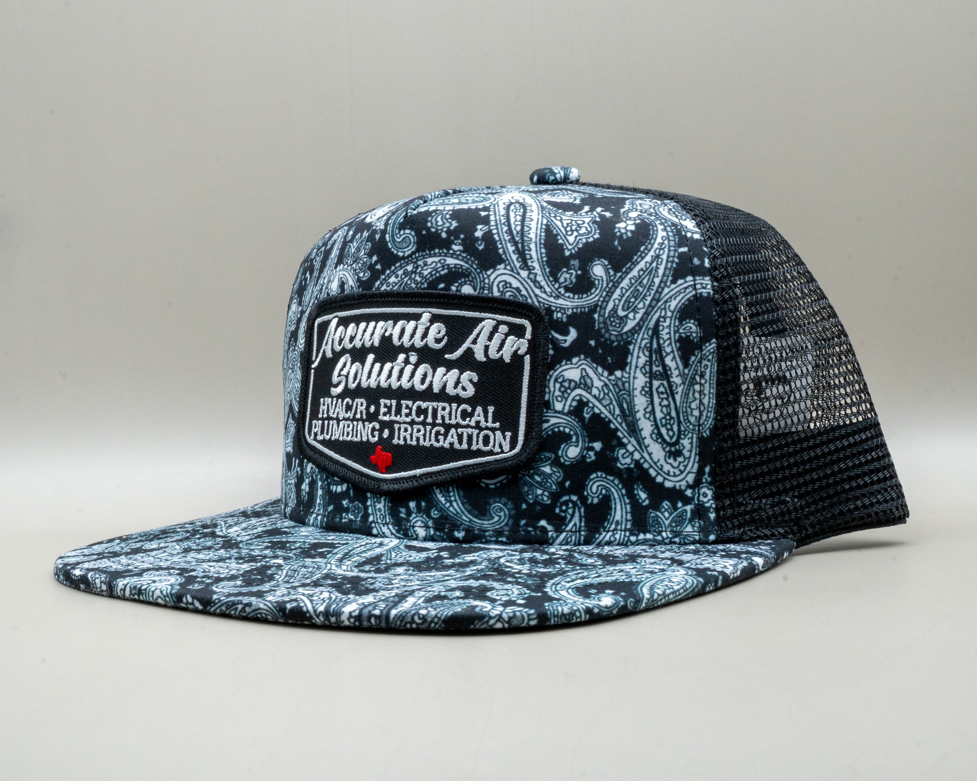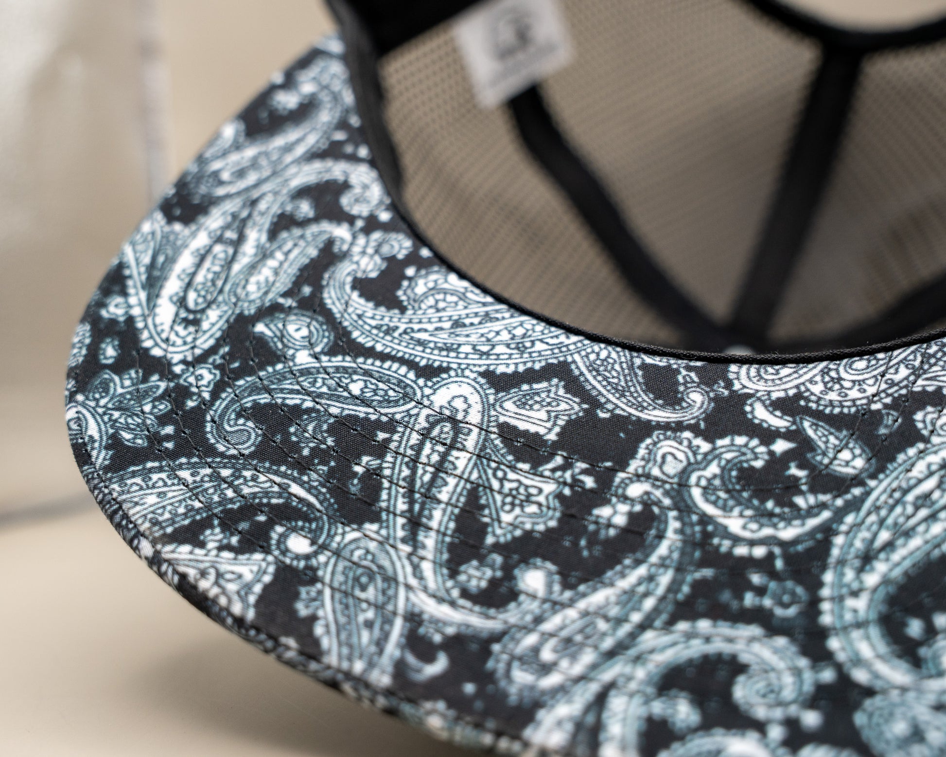 Western roots meet modern edge in Outlaw Standard. With a bold black and white paisley front and bill, black trucker mesh, and a clean black-and-white logo patch, this flat bill snapback doesn’t follow trends—it sets them. Classic. Gritty. Unapologetic.