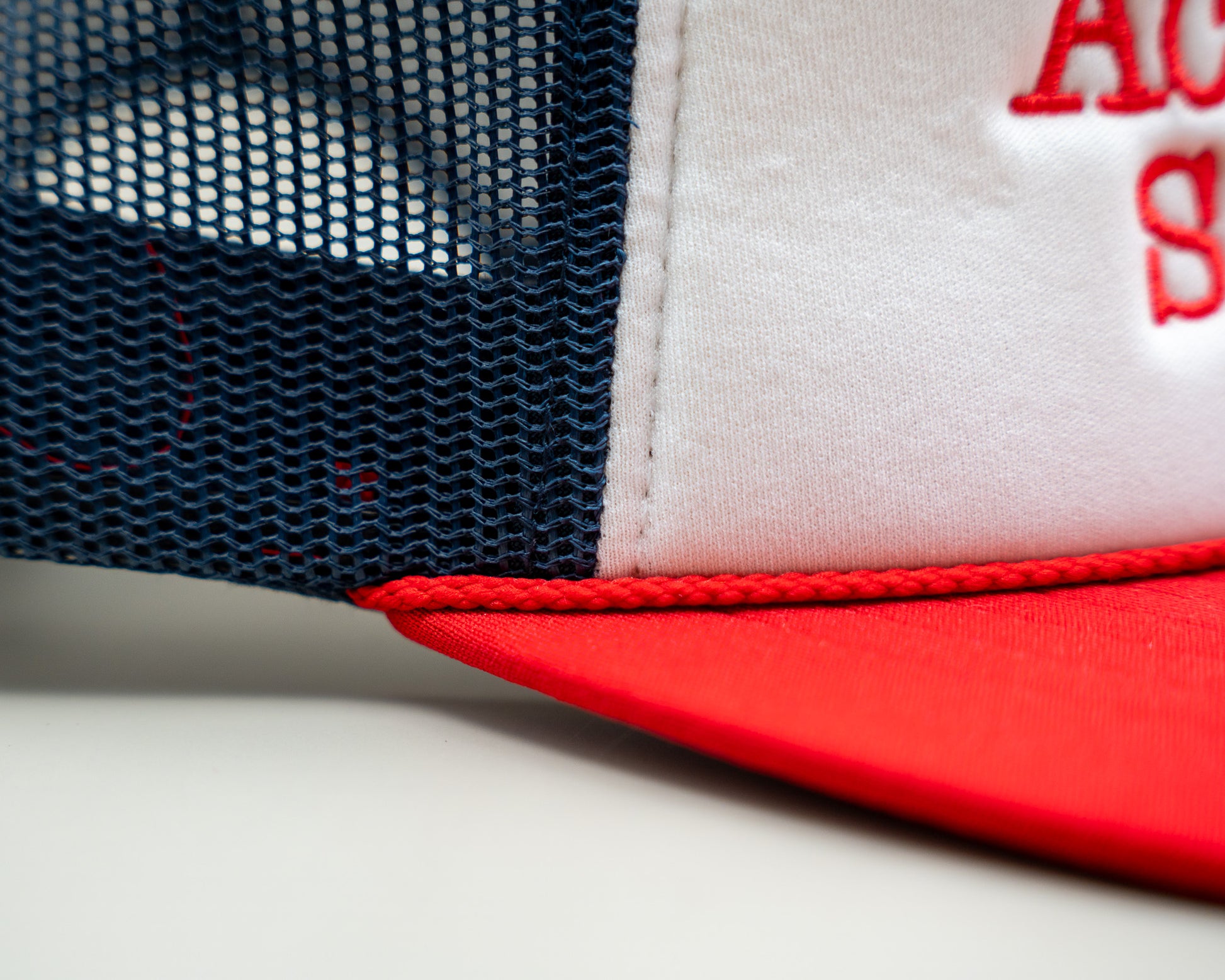 Bold but balanced—Signal Fade brings together a crisp white canvas with striking red embroidery and bill, grounded by a deep navy mesh back. Patriotic, powerful, and sharp, this one stands out whether you’re working or winding down.